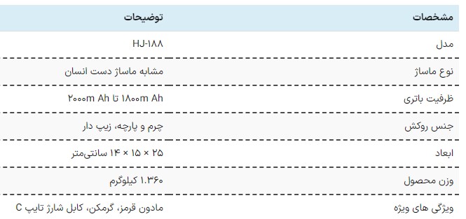 جدول مشخصات ماساژور برقی گردن و شانه مدل HJ-188